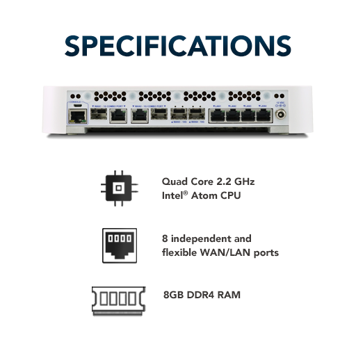 Hálózati portok: (2) 10 GbE SFP+ port, (2) 1 GbE kombinált port (RJ45/SFP) és (4) különálló, nem kapcsolható 2,5 Gbps-os port sokoldalú WAN-kapcsolatot tesz lehetővé.