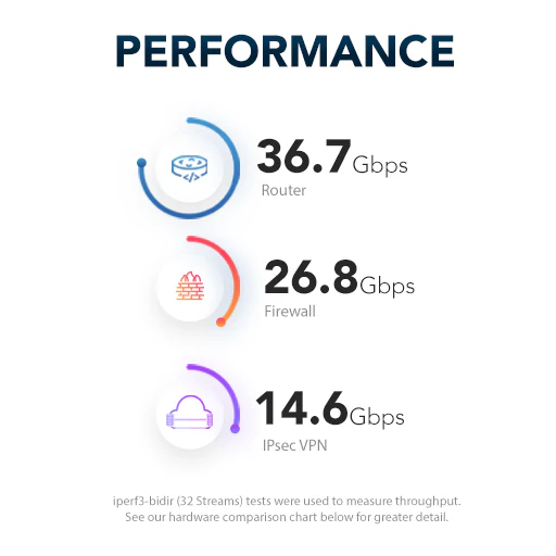 CPU : Nyolcmagos 2,0 GHz-es Intel Xeon CPU. 36 Gbps-os útválasztást biztosít a mindennapi iPerf3 kétirányú forgalomhoz, és több mint 26 Gbps-os tűzfal-átviteli sebességet.